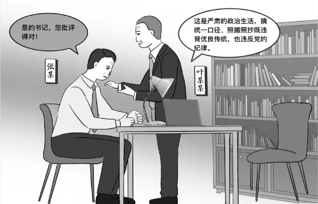 图中案例,张某在接受镇党委书记批评后,端正了态度,在民主生活会上严肃认真开展批评和自我批评。但在现实中,的确也有个别党员领导干部开展批评和自我批评时敷衍了事,搞“你好我好大家好”。这种做法有违“严肃党内政治生活”的优良传统,如果在政治上造成不良影响或者严重后果,应按《中国共产党纪律处分条例》第七十六条之规定给予相应处分。