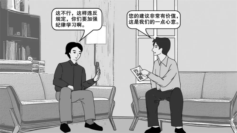 图中案例,李某某邀请刘某某前来调研指导工作,并拟在调研后变相以咨询费名义给予其好处,被其拒绝。实践中,若有党员干部以讲课费、课题费、咨询费等名义行变相送礼、收礼之实,应按照《中国共产党纪律处分条例》第九十八条之规定给予纪律处分。