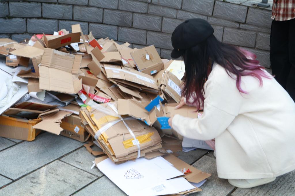 10月26日下午2点,活动正式开始。同学纷纷行动起来,将自己积攒的旧纸板、废书和塑料瓶带到了回收站点,用实际行动支持着校园绿色回收活动。在回收现场,工作人员耐心地引导同学们正确分类投放,准确地对废品进行分类集合,并进行检查、清点、存放。