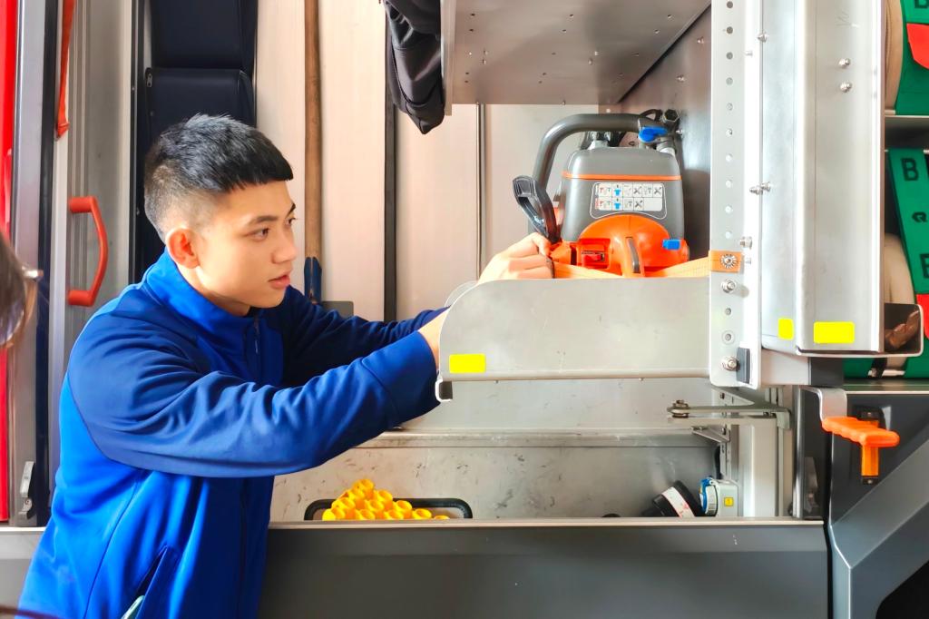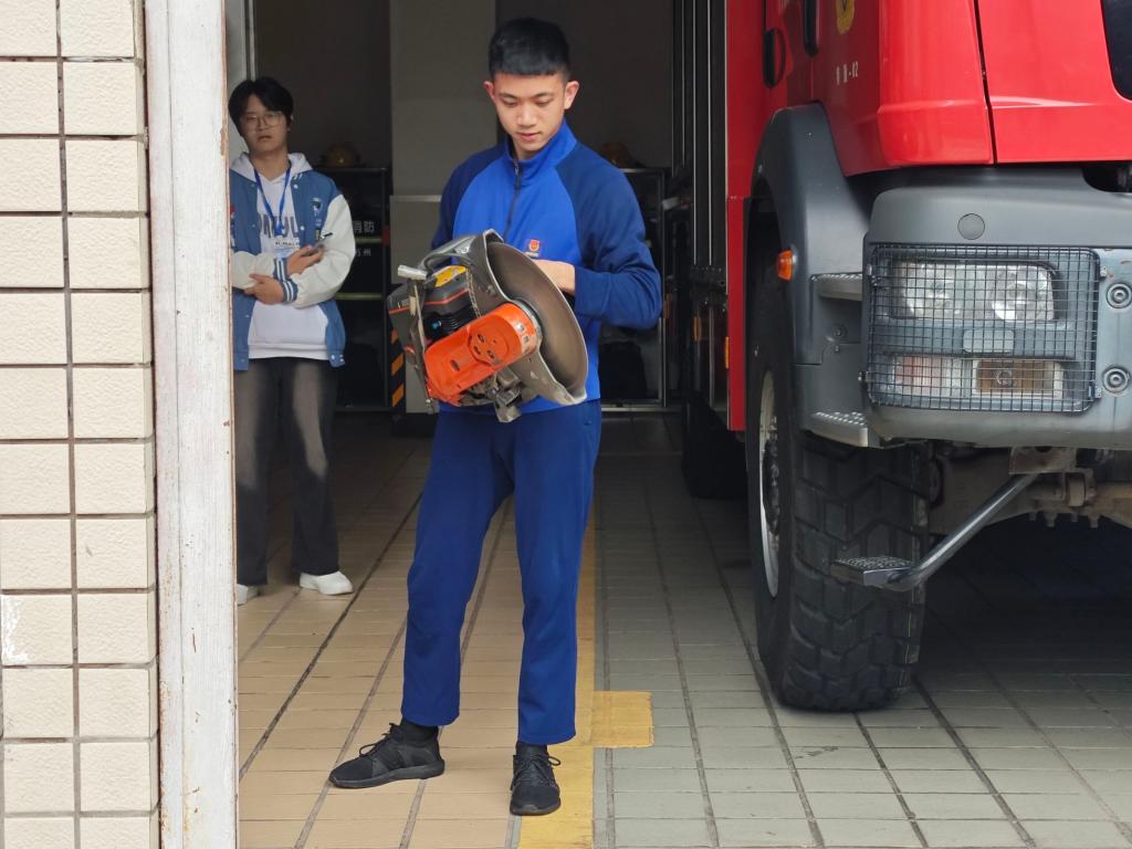 活动伊始,特勤站消防员带领大家参观和了解消防站内的各类消防车辆,让同学们对消防救援的硬件设施有了清晰的认识。随后,指导员带领同学们参观消防员的内务并观摩他们的日常训练。消防员干净的内务、繁重的训练体现出他们工作的艰辛。最后,指导员讲述了使用灭火器的技巧,并结合实际案例讲解在遭遇火灾时应采取的正确逃生措施。他强调,同学们面对火灾时要保持冷静,第一时间拨打 119 报警电话,同时积极开展初期灭火工作。