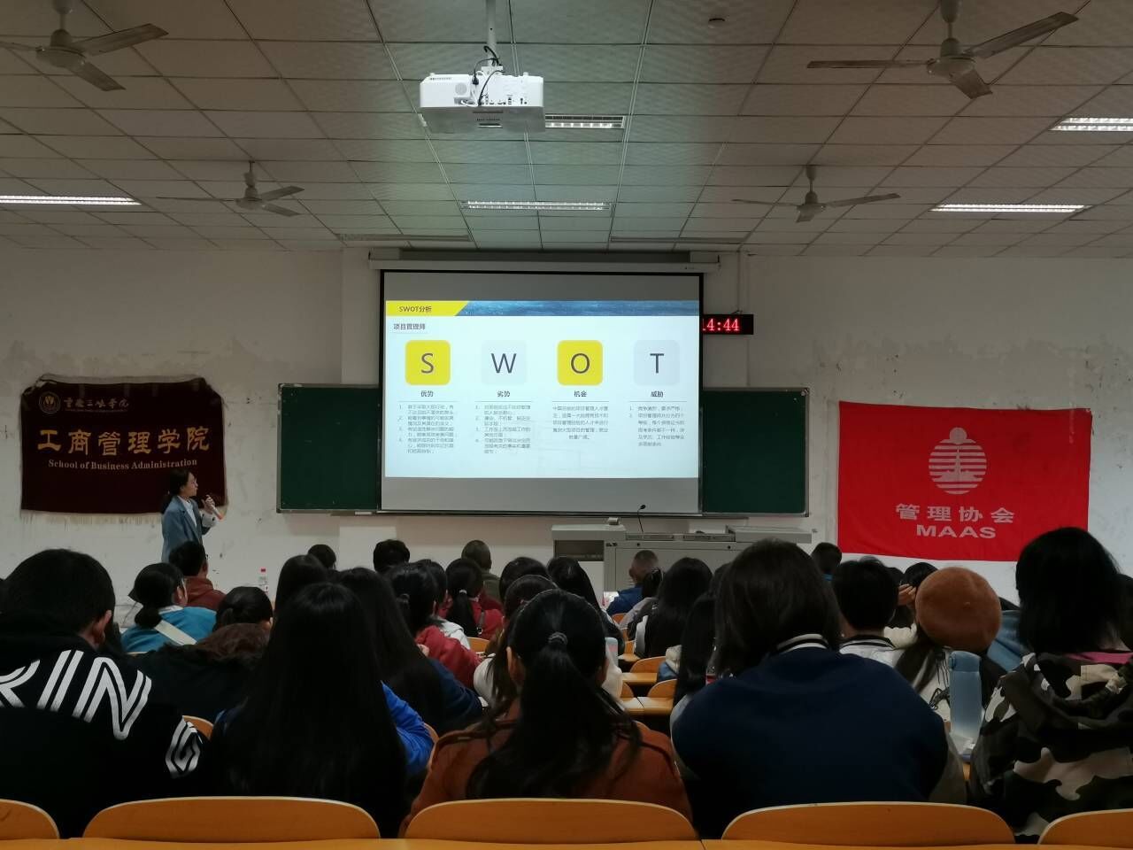 比赛伊始,选手依次上台演示个人PPT,同时评委打分。比赛中场休息环节,管理协会工作人员杨沁霖带来歌曲演唱和有奖竞答,活跃了会场的气氛,提高了同学们的对此次比赛的参与度积极性。