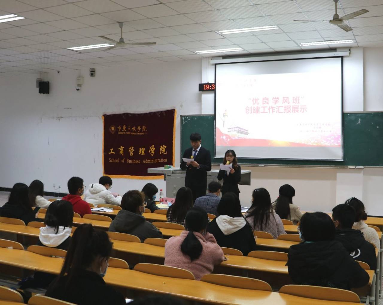 活动伊始,参赛班级汇报人分别围绕班级概况、学风建设、创建成果、展望未来四大板块依次上台各抒己见。无论是班徽、班旗的介绍,还是暖心短片的记录,都很好的展示了各班的优良学风。新生班委代表们也认真听取学长学姐的建设成果,为本班的学风建设打好基础。