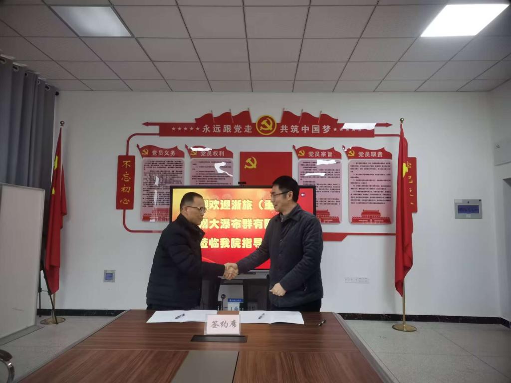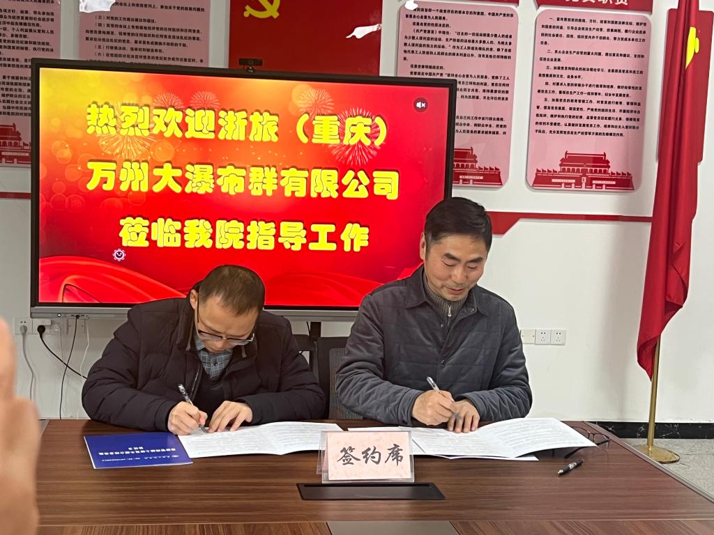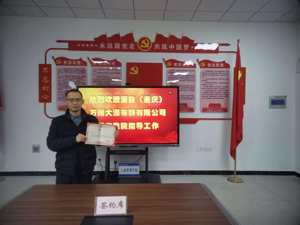 在与会人员的共同见证下,颜帮全教授与浙旅(重庆)万州大瀑布群有限公司总裁赵鑫立签订了研究生联合培养协议书并授牌,同时向浙旅(重庆)万州大瀑布群有限公司总裁赵鑫立颁发了研究生校外导师聘书。