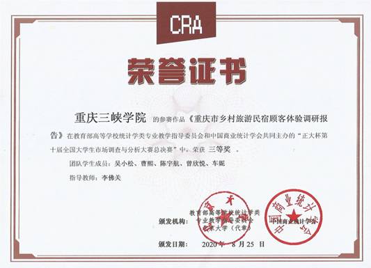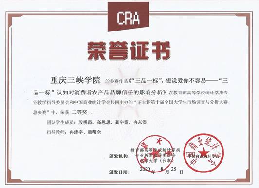 我院学生作品《“三品一标”,想说爱你不容易——“三品一标”认知对消费者农产品品牌信任的影响分析》获全国二等奖(指导老师:冉建宇、颜帮全),《重庆市乡村旅游民宿顾客体验调研报告》获全国三等奖(指导老师:李佛关)。