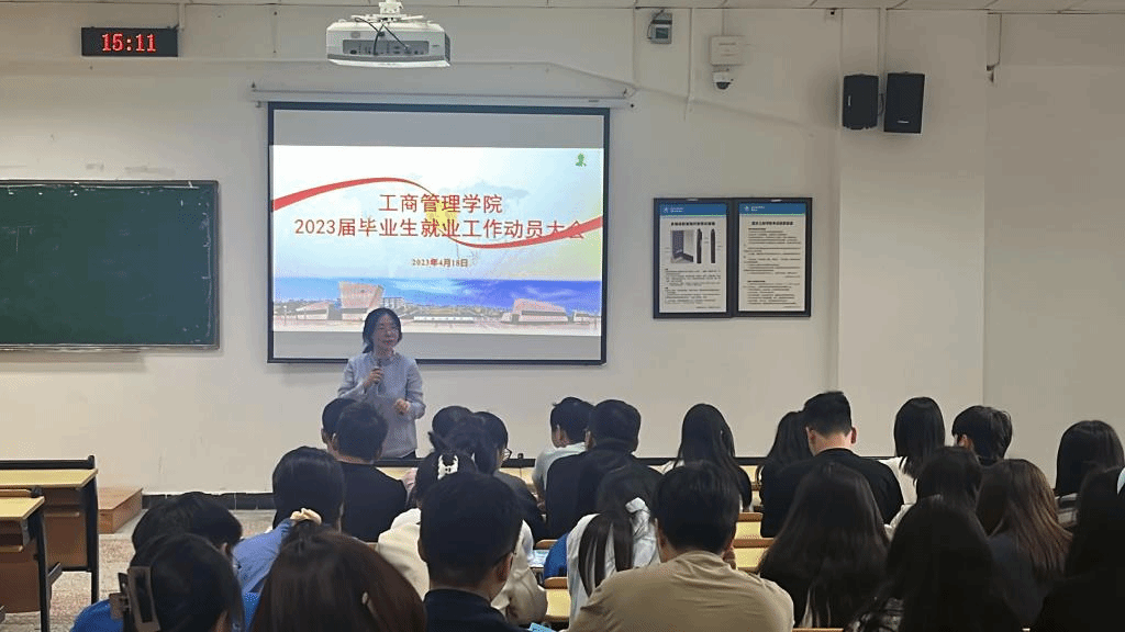 首先,刘亚兰书记以提问的方式拉进与同学们的距离,活跃大会气氛,积极分析就业情况和未来发展方向,鼓励同学们抓住身边资源,提高就业率,写好毕业论文等准备工作。随后副书记李中春用我院2023年毕业生就业率引出了我院毕业生“就业难”问题,并激励了同学们积极就业。