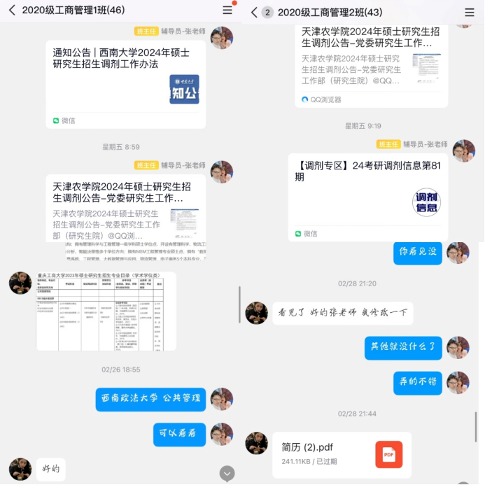线上,学院依托QQ等方式为学生提供复试和调剂的各类信息,分类筛选、逐一对接。线下,毕业班辅导员一对一为学生把脉问诊,对进入到复试环节的同学提供从自我介绍、专业知识测试、综合面试以及复试流程和评分标准等全方位指导,为同学们提供了具体的备考建议。针对需要调剂考生,辅导员分析当前调剂市场形势,解读调剂政策和流程,提醒同学们要密切关注信息,合理定位调剂目标,积极与意向院校进行沟通联系。此外还通过分享往届学生成功调剂案例和经验,鼓励同学们保持信心,积极面对挑战。