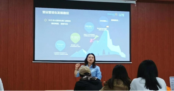 会议伊始,沃尔玛万州区的代表向同学们介绍本次管培生活动概况,并向所有参会学生介绍自己介绍沃尔玛公司创始人以及沃尔玛目前的全球情况,向同学们介绍该公司的两大主力业态——沃尔玛大卖场和山姆会员超市,这让同学们更清晰的了解了该企业。了解了企业大概情况后,会议进行到第二部分,主讲人开始介绍本次招聘的岗位——管培生。她分别从以下四个方面对该职业进行了介绍:第一,在晋升方面有为期两年半的成长培训,第二,该公司有一对一专业教练指导。第三,岗位升职要求。第四,不同部门与分区的各项工作指标负责。