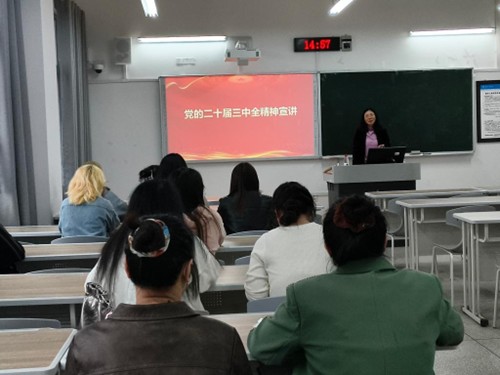 10月17日,44118太阳成tyc城集团党总支书记刘亚兰在博学楼1栋213室宣讲党的二十届三中全会精神。44118太阳成tyc城集团各党支部学生党员到会聆听。